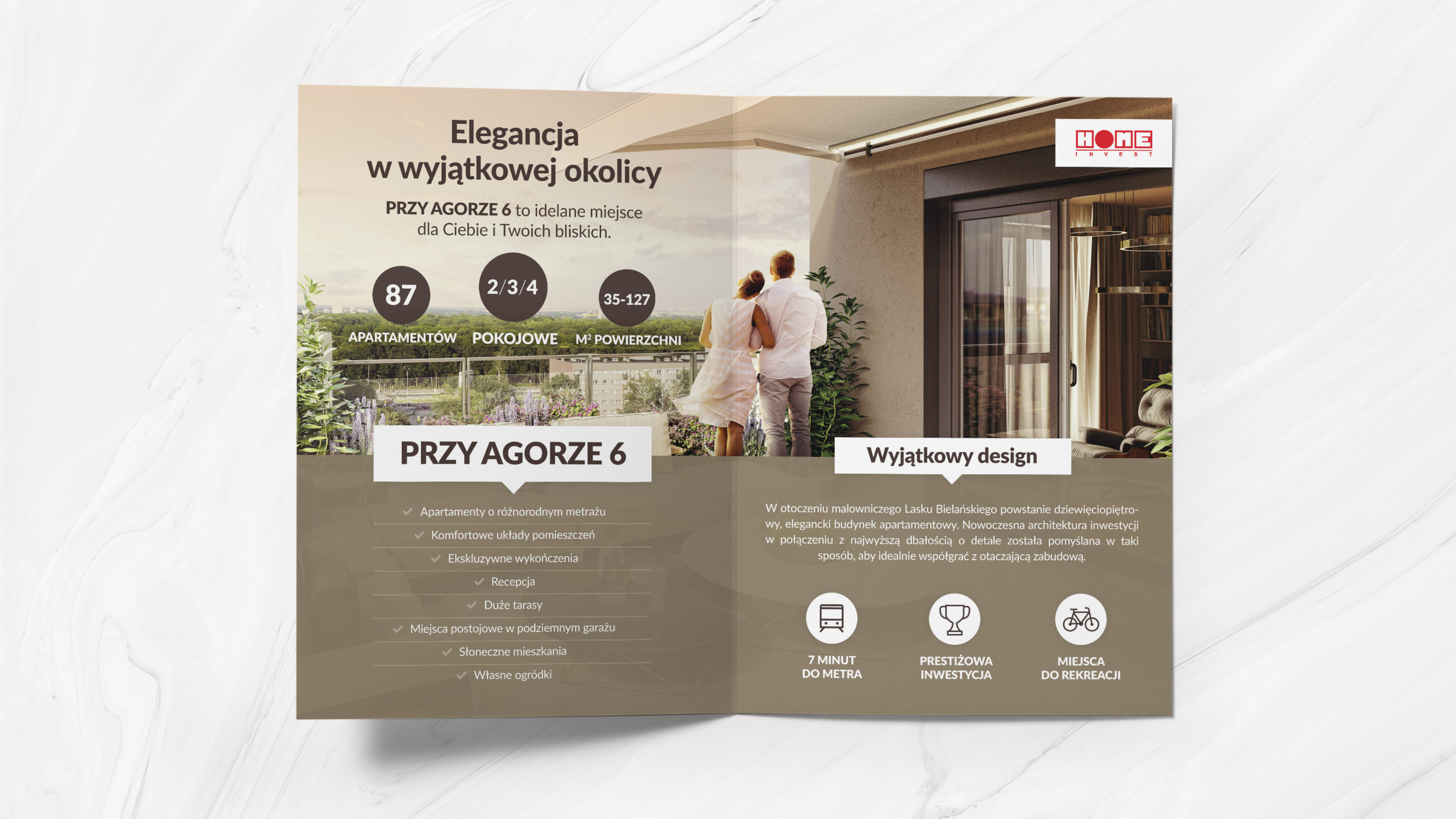 Dla firmy Home Invest – dewelopera z Warszawy zaprojektowaliśmy folder promocyjny dotyczący inwestycji „Przy Agorze 6”.