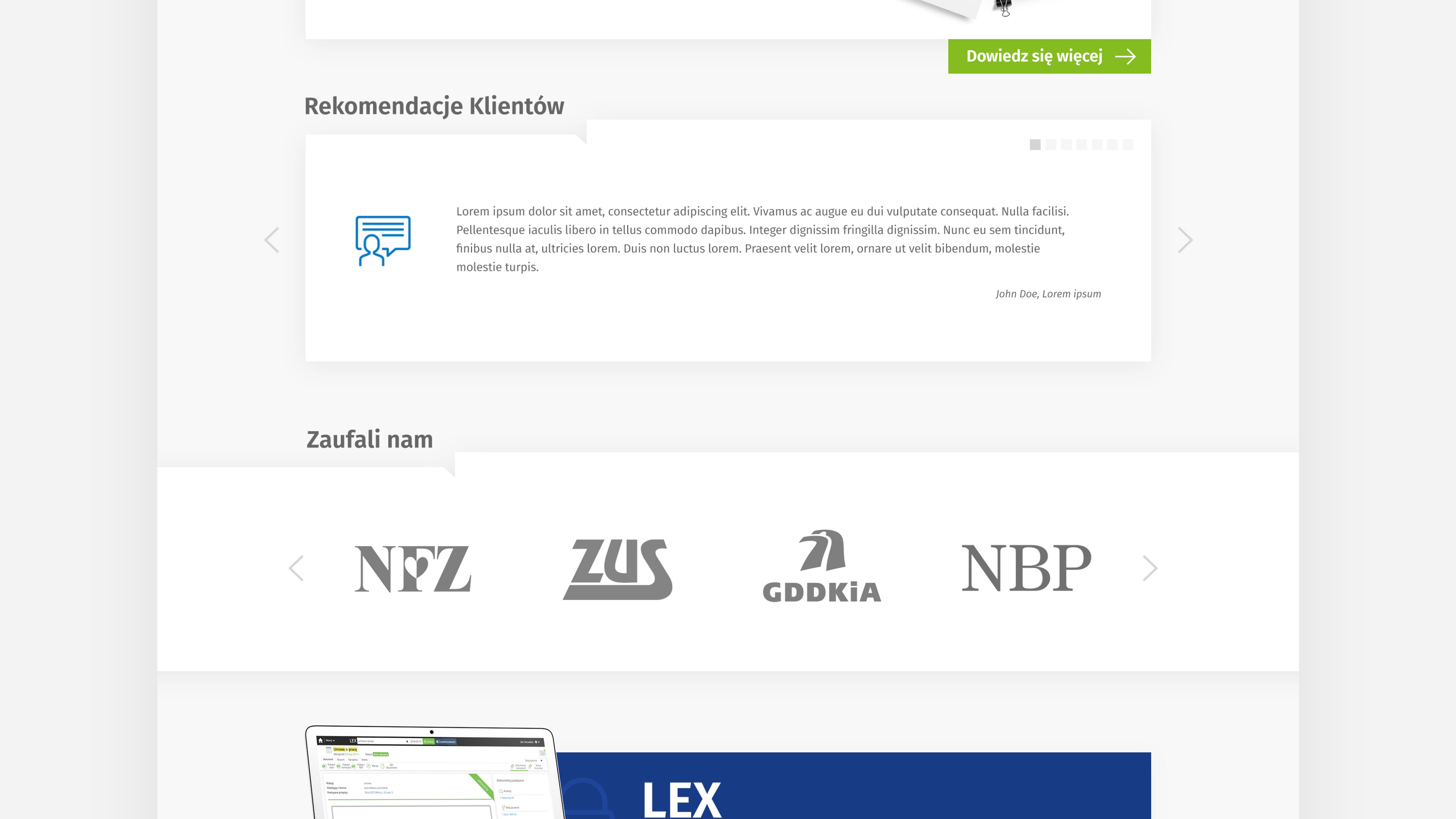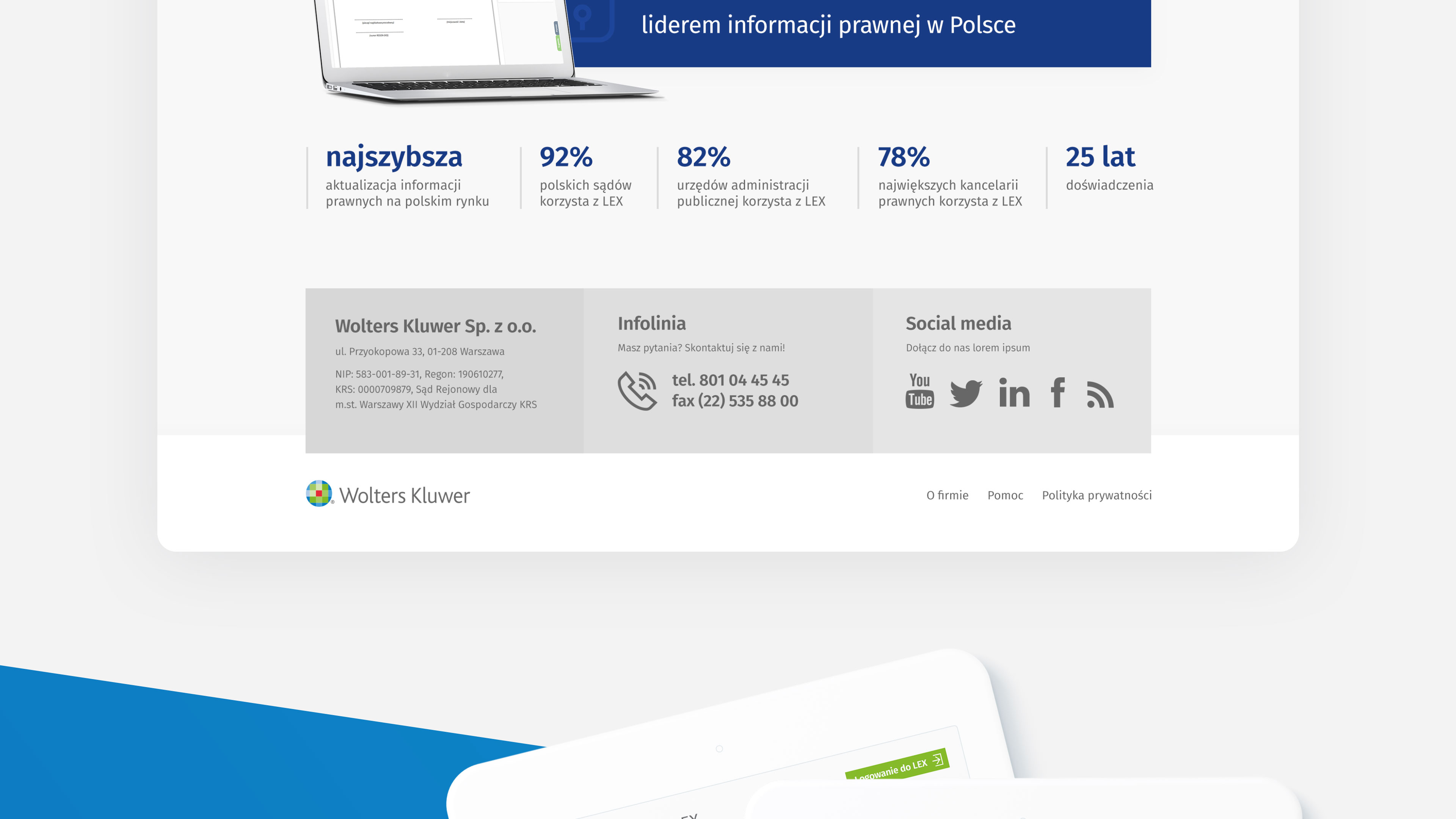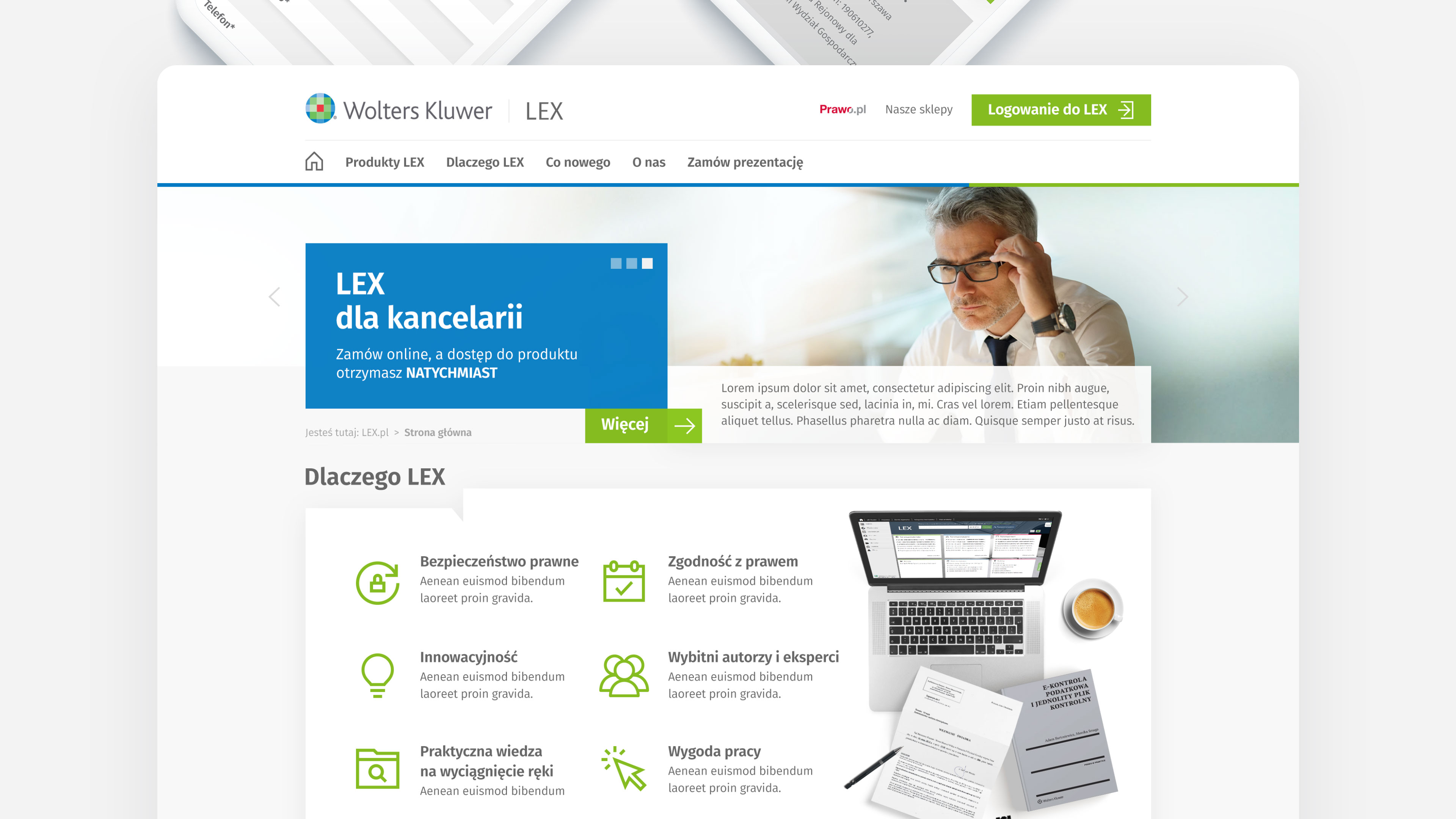 Jesteśmy odpowiedzialni za projekt strony LEX.pl. LEX to produkt elektroniczny, będący zbiorem prawa, orzecznictwa i piśmiennictwa prawniczego. Jego twórcą i wydawcą jest koncern Wolters Kluwer zajmujący się publikacjami z zakresu prawa i biznesu.